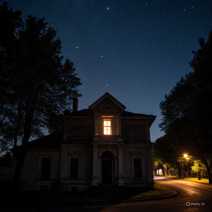 In the upstairs window, a faint glow.