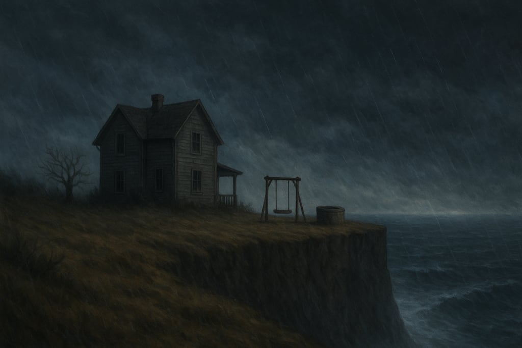 The house at the end of the world is grey and weathered, standing precariously close to the edge of a tall, grey cliff that overlooks the ocean as it spills endlessly into the void. In the house’s back yard stands a grey wooden swing and a grey stone wishing well that ran out of wish-granting juice some time ago, give or take a thousand years.