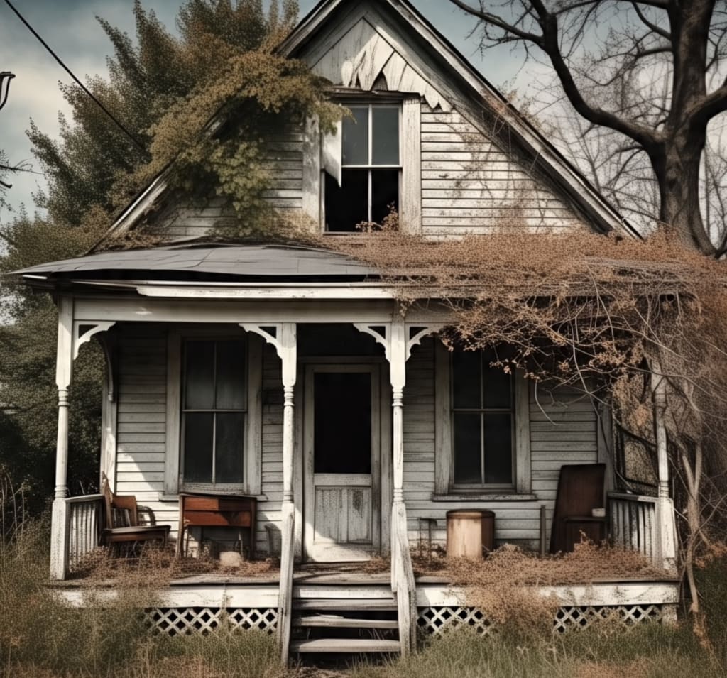 The yard was wild with weeds. Vines twisted up the walls like green veins, and puddles reflected a sky swollen with clouds. She climbed the porch steps slowly. The swing moved, gently, as if rocked by an invisible hand.