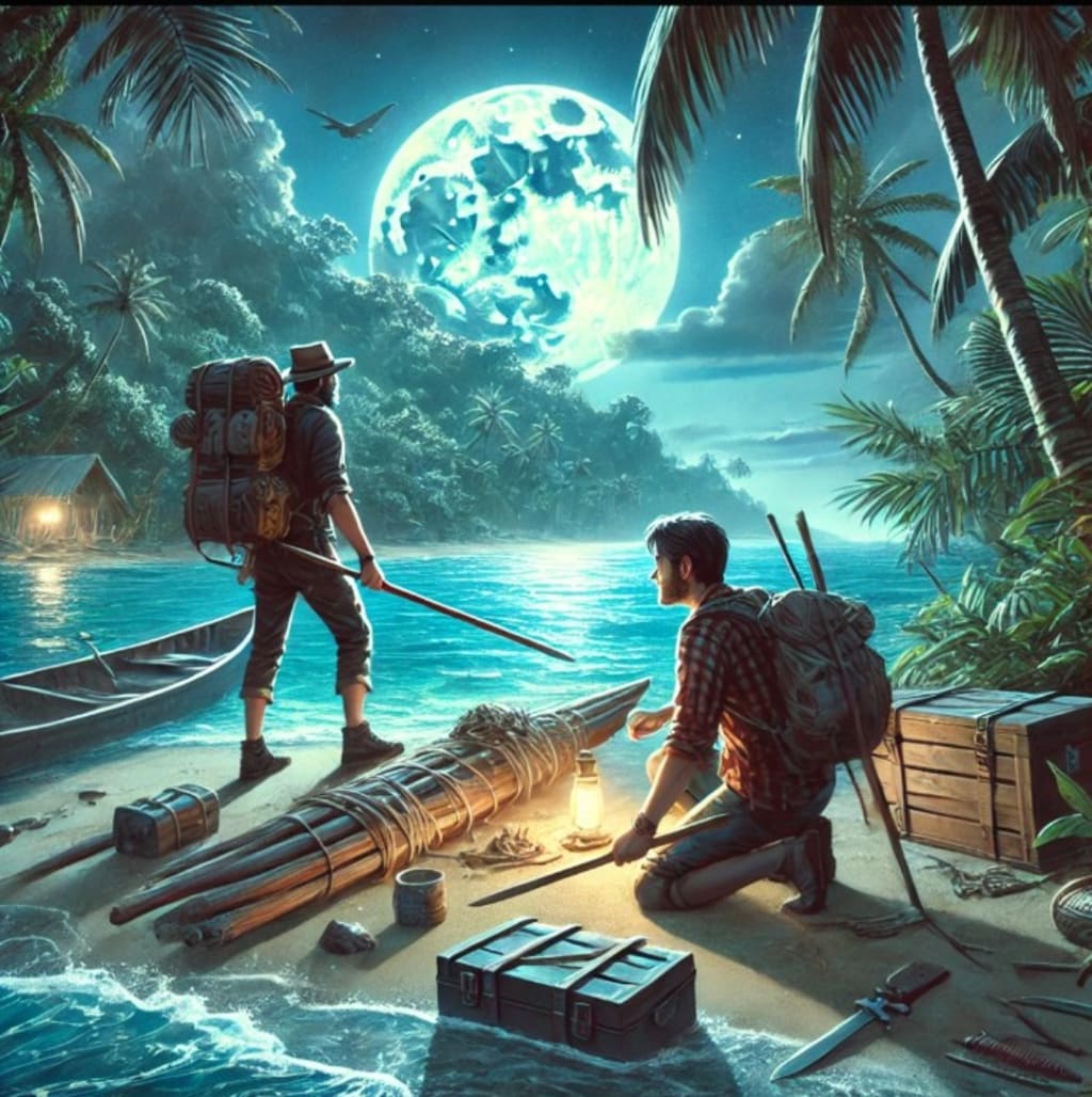 Two friends find themselves marooned on a tropical island surrounded by dense jungle and mysterious secrets. Under the glowing moonlight, they work tirelessly to construct a raft, symbolizing their determination to escape and survive. The jungle emanates an eerie glow, hinting at hidden mysteries and challenges ahead, while the lapping ocean waves create an atmosphere of hope and adventure.