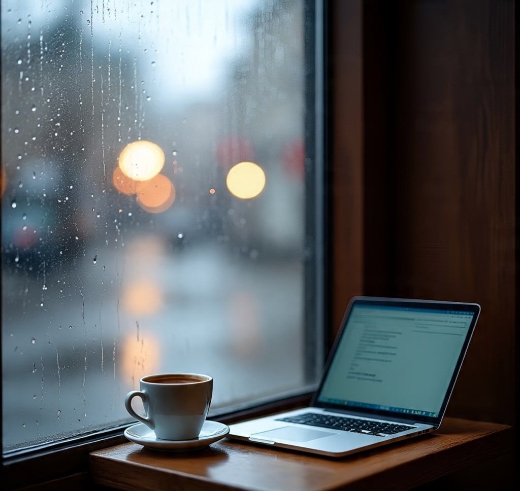 Rain slid lazily down the wide glass window, tracing lines like tears that refused to fall. The air smelled of roasted beans and soft nostalgia — the kind that only quiet places carry after the morning rush is gone.
