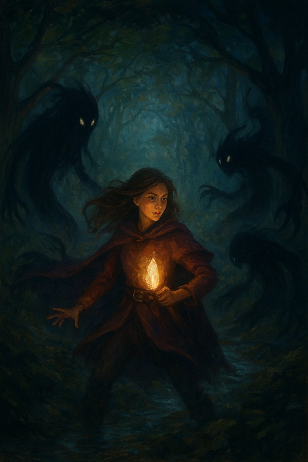 Elyra ventured out, carrying nothing but courage and a lantern. That’s when she first saw them tall, dark shapes with eyes like molten silver. They moved without sound, gliding across the forest floor. Fear surged through her, but instinct guided her. She raised the crystal, and light erupted, forcing the shadows to retreat.
