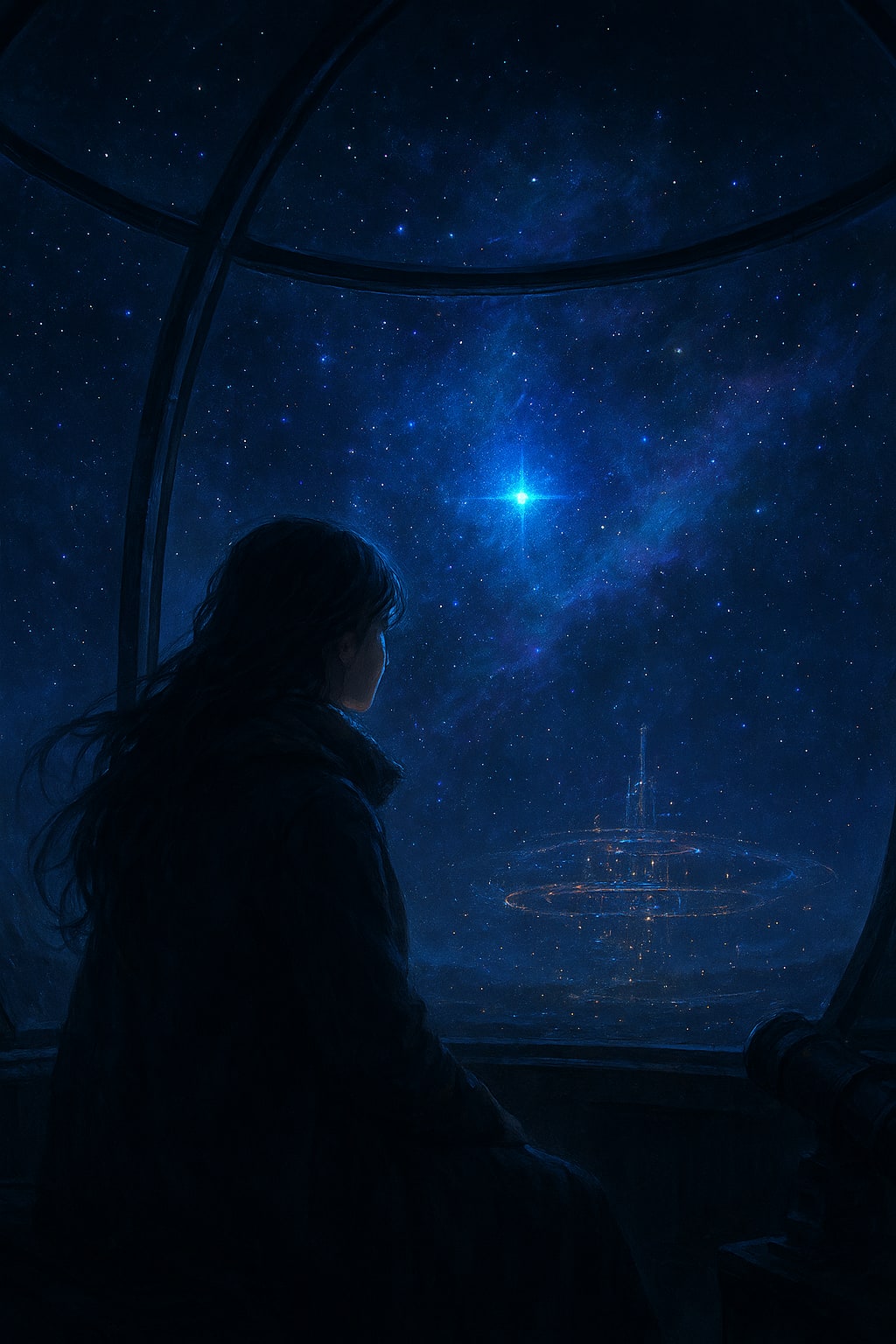 A star—enormous, sapphire-blue, wrapped in a nebula of colors no human eye was meant to see. Circling it, like jewels suspended in the void, were structures: towers of light, rings that glittered like spun glass.