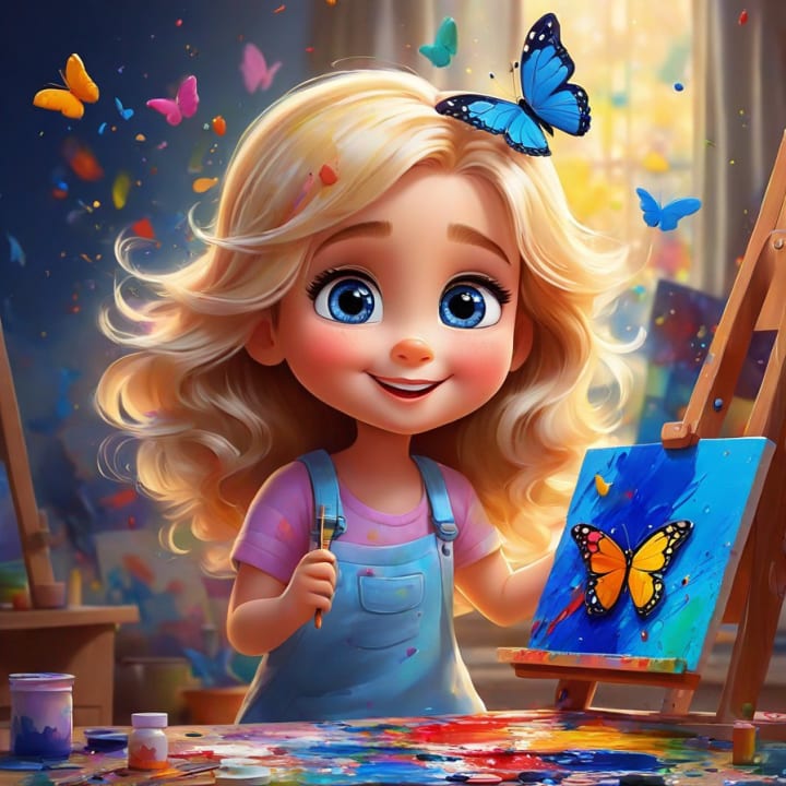 Little girl with blonde hair and blue eyes with child paint splatters on her, holding up her artwork: a partially painted butterfly on canvas; nearby, a paintbrush and colourful palette.