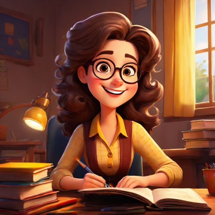 Inside, sat an old, nice female teacher, long brown hair, with a lovely grin, spectacles perched on the tip of her nose and an antique, yellowed notebook in her hand.
