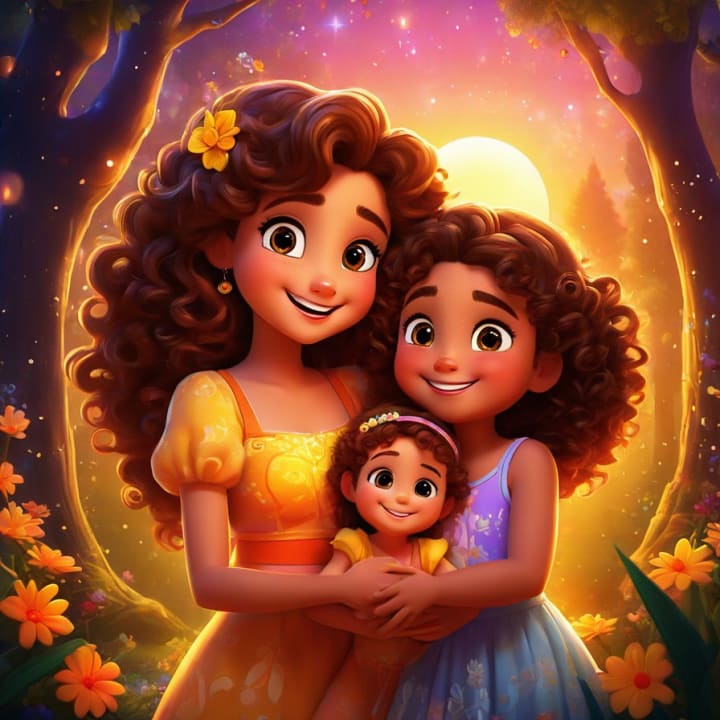 The same woods, with the bright orange-colored sunset, had an air of magic: a little girl with brown, curly hair and great brown eyes, clad in a flowy sundress underneath a shiny, bright magical top, hugging a very happy young mother wearing a sundress of bright yellow and a headband of flowers.
