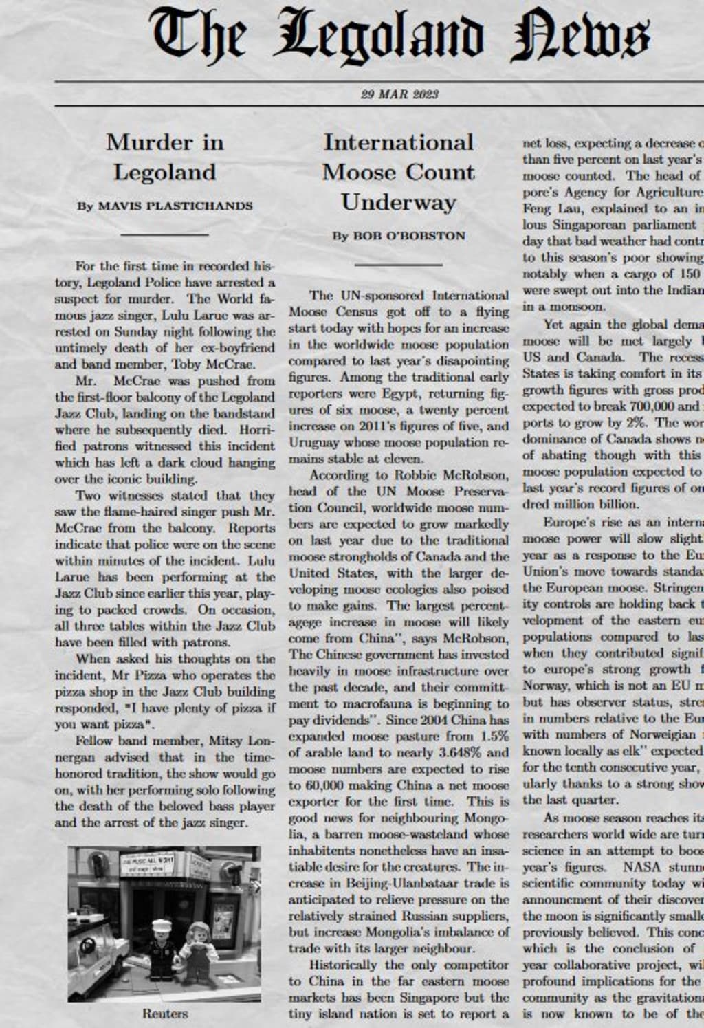 Instead, she began yelling at me, some of the words I could not comprehend. If she had a saliva gland, I would have expected spit to be flying from her mouth as she abused me. As her tirade continued, I opened the bottom drawer and withdrew the morning’s paper. Normally the headline of the Legoland news was an article on donut thefts or the unfounded claims of the greatest hero ever. Today was different. Today the paper had a picture of Lulu Larue being walked from the Jazz Club in handcuffs, with the bold headline “Murder in Legoland”.