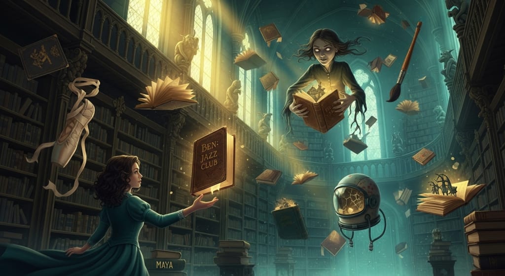 No ordinary library. Books floated in midair, tethered by wisps of light. Their spines shimmered with titles like: