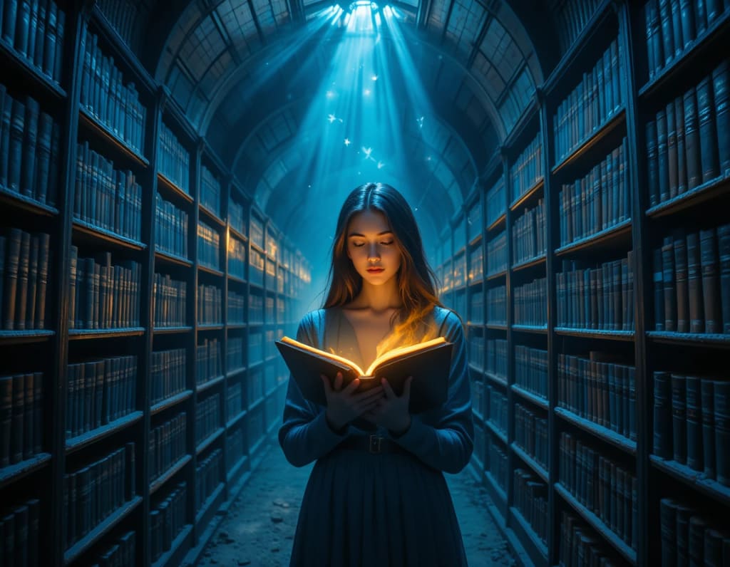 Inside, dust danced in golden shafts of afternoon light. Wooden shelves towered to the ceiling, bending under the weight of books so old their spines no longer bore titles. A clock ticked somewhere, its chime echoing like breath through the silence.