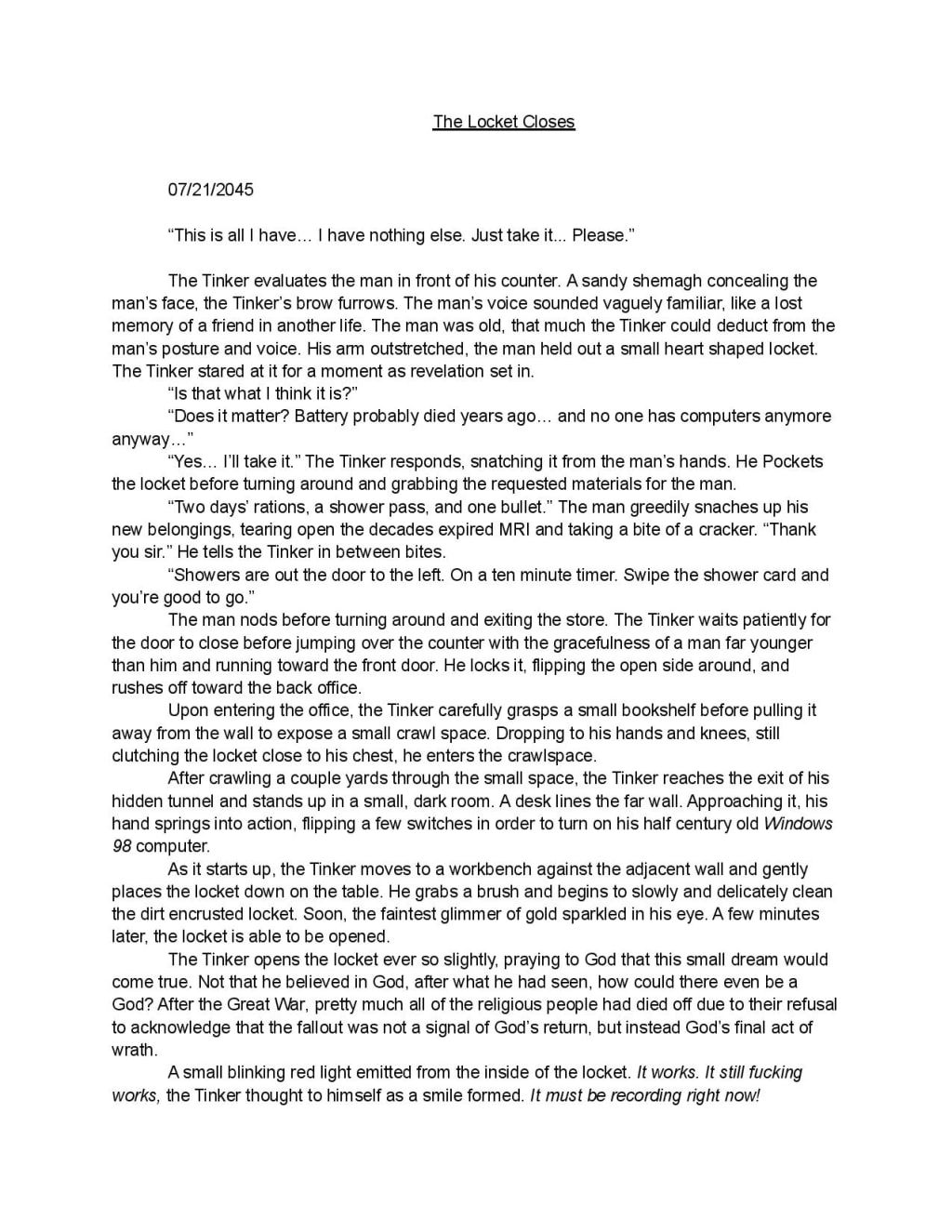 07/21/2045“This is all I have… I have nothing else. Just take it... Please.” The Tinker evaluates the man in front of his counter. A sandy shemagh concealing the man’s face, the Tinker’s brow furrows. The man’s voice sounded vaguely familiar, like a lost memory of a friend in another life. The man was old, that much the Tinker could deduct from the man’s posture and voice. His arm outstretched, the man held out a small heart shaped locket. The Tinker stared at it for a moment as revelation set in. “Is that what I think it is?” “Does it matter? Battery probably died years ago… and no one has computers anymore anyway…” “Yes… I’ll take it.” The Tinker responds, snatching it from the man’s hands. He Pockets the locket before turning around and grabbing the requested materials for the man. “Two days’ rations, a shower pass, and one bullet.” The man greedily snaches up his new belongings, tearing open the decades expired MRI and taking a bite of a cracker. “Thank you sir.” He tells the Tinker in between bites. “Showers are out the door to the left. On a ten minute timer. Swipe the shower card and you’re good to go.” The man nods before turning around and exiting the store. The Tinker waits patiently for the door to close before jumping over the counter with the gracefulness of a man far younger than him and running toward the front door. He locks it, flipping the open side around, and rushes off toward the back office. Upon entering the office, the Tinker carefully grasps a small bookshelf before pulling it away from the wall to expose a small crawl space. Dropping to his hands and knees, still clutching the locket close to his chest, he enters the crawlspace. After crawling a couple yards through the small space, the Tinker reaches the exit of his hidden tunnel and stands up in a small, dark room. A desk lines the far wall. Approaching it, his hand springs into action, flipping a few switches in order to turn on his half century old Windows 98 computer. As it starts up, the Tinker moves to a workbench against the adjacent wall and gently places the locket down on the table. He grabs a brush and begins to slowly and delicately clean the dirt encrusted locket. Soon, the faintest glimmer of gold sparkled in his eye. A few minutes later, the locket is able to be opened. The Tinker opens the locket ever so slightly, praying to God that this small dream would come true. Not that he believed in God, after what he had seen, how could there even be a God? After the Great War, pretty much all of the religious people had died off due to their refusal to acknowledge that the fallout was not a signal of God’s return, but instead God’s final act of wrath. A small blinking red light emitted from the inside of the locket. It works. It still fucking works, the Tinker thought to himself as a smile formed. It must be recording right now! He quickly flips the locket over and pops off the back to reveal a micro-sd card slot… with the sd card still inside. If my life was a movie, the Hallelujah chorus would be blaring right now. The Tinker pops out the micro sd card and approaches the now booted up computer. After surveying and selecting the proper adapter, he clicks the sd card into its rightful place and waits for the videos to flash onto the screen. He hadn't been this excited in years. A few moments later a cluster of files flashed onto the screen. He clicks on the first one, bringing up the image of his face from moments before. He laughs out loud as he watches the video of him opening the locket and the smile forms on his face. He quickly exited out of the video and clicked the next titled 06/06/2049. 06/06/2045 - PlayingBlinding light. Rustling. A face flashes on the screen for a moment before disappearing. It appears again. A man’s bearded face, sunburnt and weathered, almost indiscernible from a strip of leather, is displayed. The same man who bartered with the Tinker appears on the screen. “I’ve tried. I’m sorry. I held out for as long as I could. I have nothing left. Not like it matters. No one will ever see this anyway. I don’t even know if this thing is still recording. But if you can see me,” the man looks toward the heavens. “I love you both. Goodbye.” The locket closes. 03/21/2045 - PlayingThe Man takes a bite of meat. He smiles at the camera. “Thank you. Thank you for watching over me.” The locket closes. 03/20/2045 - PlayingThe Man holds the clasp close to his face. “I haven’t checked in for a while, but I just wanted to tell you that I miss you…” Tears fill his eyes. “I’m almost out of food and I don’t know how much longer I can keep going… but if you’re up there. Please send me something. Anything. A rabbit. A deer. Something.” The locket closes. 12/21/2043 - Playing The man shivers before taking a sip from a flask. “It’s fucking cold… It’s Christmas… or close to it. I found a flask of something at an abandoned cabin a few days ago. It was a good Christmas gift… It’s fucking cold.”The locket closes. 08/23/2036 - Playing Hands open the locket, but the man is not viewable. Instead, two gravestones are seen. “I miss you both so much.” The locket closes. 04/19/2032 - PlayingSunlight. Sky. Clouds. Blood. Bodies. Bullets. The pendant’s camera points skyward as bloody hands pull away. Loud sobbing is heard as the man, bruised and bloodied, enters the frame. He picks up the locket and holds the chain close as he continues to crawl. His sobbing is heard as he finally stops at something and wrapping his arms around a naked body in front of him. The locket bounces around his hand as he sobs and heaves, displaying the scene around him in flashes. Two Naked women. Five bloodied men. The man sobs more. “I’m sorry I wasn't strong enough. I wasn’t strong enough. This is all my fault. I’m sorry.” The man continues to sob. The locket comes to a rest on the beaten and bloodied face of 