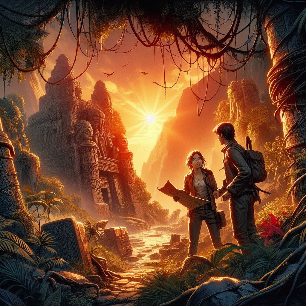 The sun was setting over the dense jungle, casting a golden glow over the lush foliage. Dr. Maria Rodriguez, a renowned archaeologist, stood at the edge her eyes fixed on the ancient map etched on a crumbling stone pedestal.