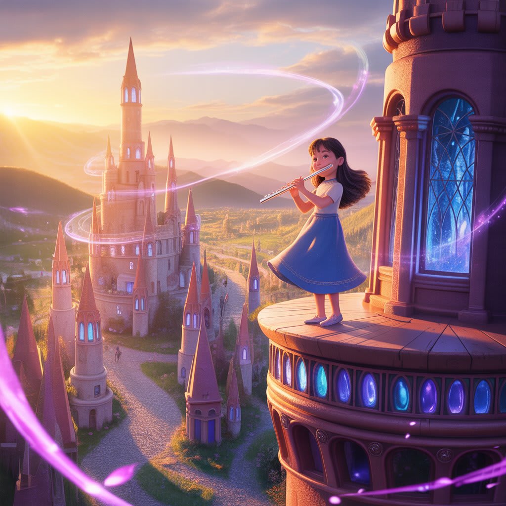 One evening, a storm approached Aeria. The spires groaned under the force of the howling wind. As the usual harmony broke down, the people became frightened. Elea knew this was her moment. She climbed to the top of the tallest spire, her flute in hand, and played with all her heart.