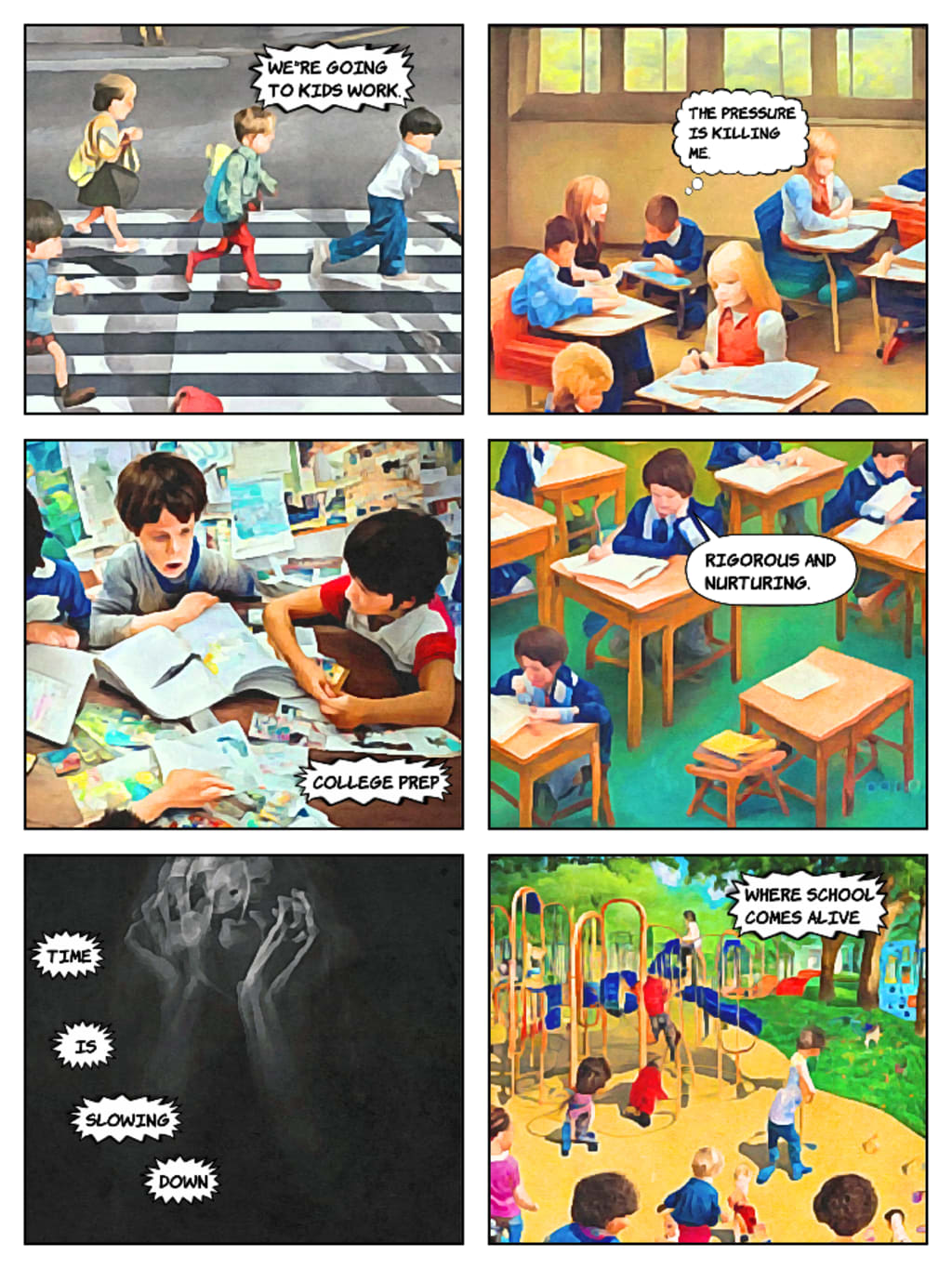 Parents send us on our way to the learning institution. On the way, it dawned on us. We were part of a larger machine, and it was trying to force us into the grinder. As they travel, they all feel as if they are going to work like their parents. Everybody works. This is Our work. We won't be late. The sooner school ends, the sooner we can watch our cartoons and youtube. Everyone says I'm supposed to be the cog in the machine, but I don't even know my place. I'm six years old. I don't quite know what to do with myself. I want to get to school and get it over with. I like my friends but I feel like I'm in jail. Hard time will be served. Let's just get there first. Walk!