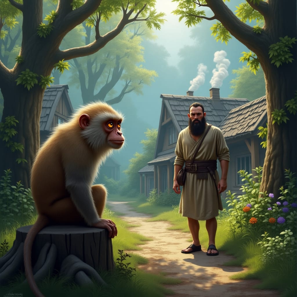 A long time ago, in a quiet village near a big forest, lived a friendly monkey named Kiki. Kiki was different from the other monkeys. While most monkeys stayed in the forest and were afraid of people, Kiki loved humans. He liked watching them talk, play, cook, and work. He found their world interesting and fun.