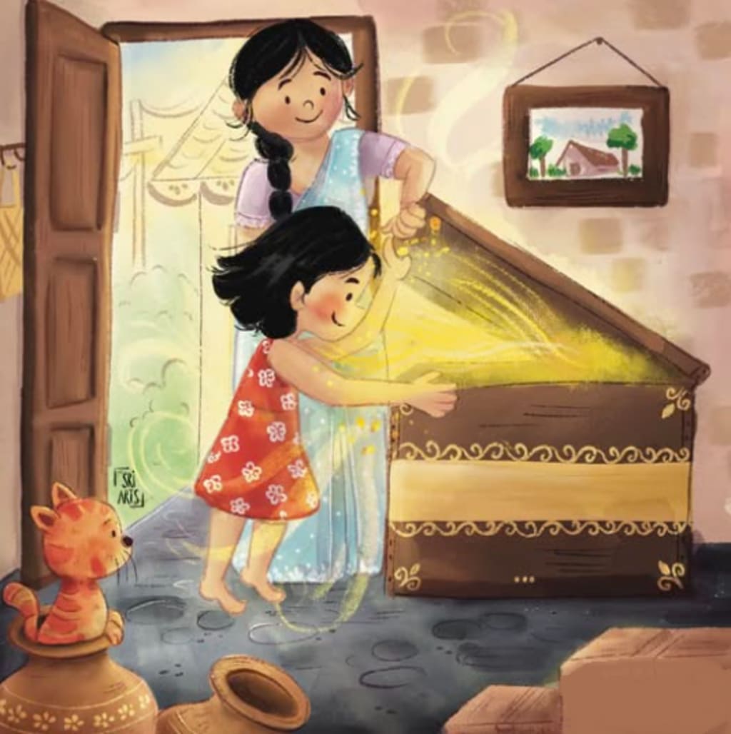 Only an adult could open that lid. It was such a heavy lid. The smell that had been lingering inside the box, impatient to get out, suddenly came out and spread throughout the entire storage room as soon as the lid was opened. That smell crept up to our noses and what a smell it was. It made us wonder how so much smell was in this big box. So we didn't think to look inside the box, we just looked.