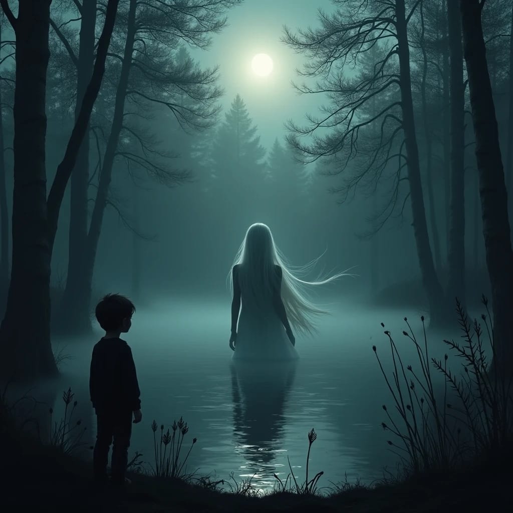 "Naa-ki." she sounds out. "They are water spirits that live within a lake at the center of the woods. They look friendly and beautiful, but they are not. They are shapeshifters that lure you to them. When you are within their grasp, they drag you down with them into the water where you can never leave." The boy gasps in shock at his mother's words.