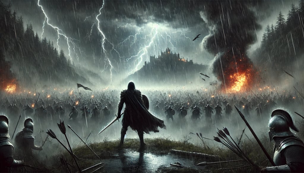 A dramatic battlefield during a thunderstorm, with a lone warrior drenched in rain standing on a soaked field at the edge of a dark forest. Lightning reveals a massive advancing army as a castle burns in the distance.