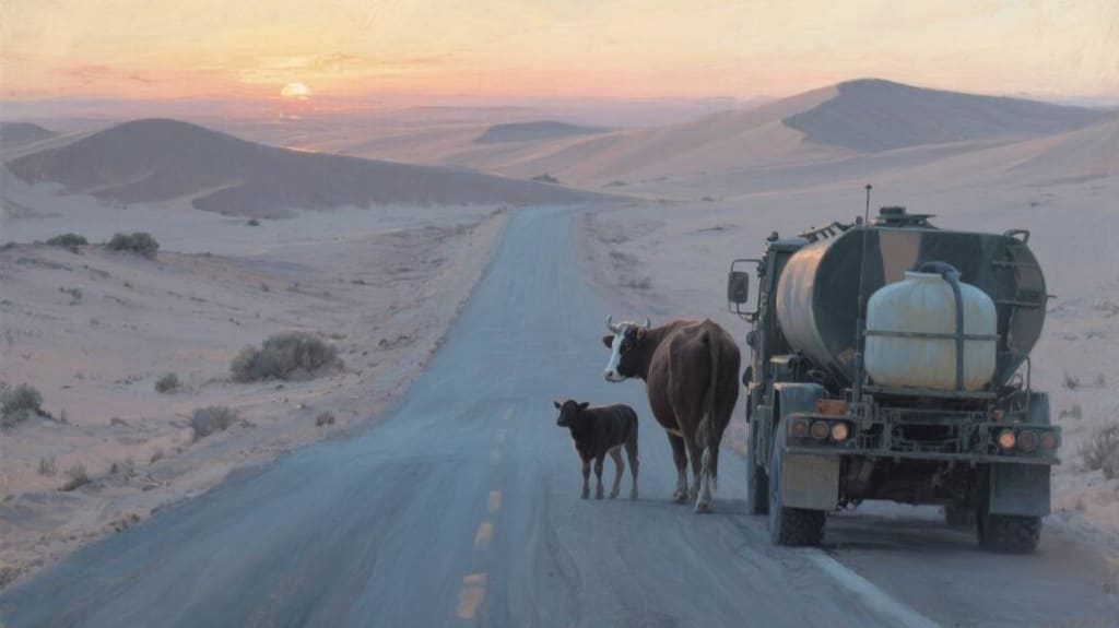One sweltering afternoon, when the sun had melted the horizon into a golden mirage, a bull—a creature known for his placid eyes and unyielding loyalty—reached the end of endurance. His ribs pressed against his leathery hide like a skeleton praying for rain, his tongue split and bleeding from the dust. Breaking free from the rope that tethered him to his master's will, he lunged toward the dusty road where military water trucks groaned under the weight of their precious cargo.