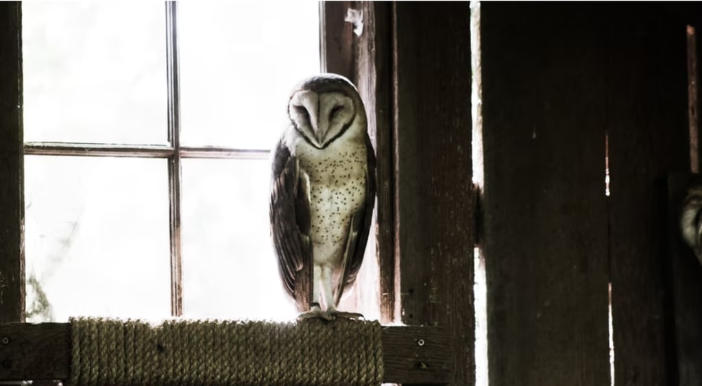 She sets herself up with a drink and a seat. Still that oppressive feeling is lingering. The house she moved into was from the early 1900's. It seemed in every corner some sort of history was lurking. Finally she looked up and there was the answer she was pursuing. At the end of the property where the abandoned barn sat in front of a cemetery was a barn owl just staring.