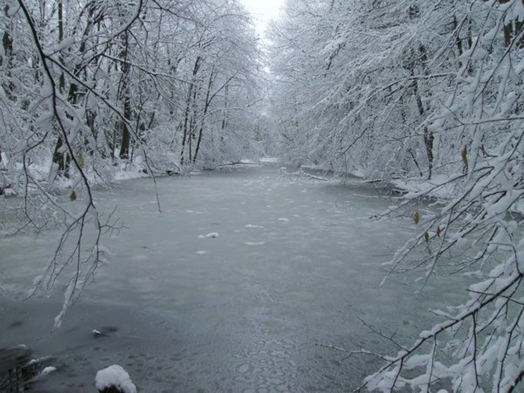 The pond was in a small clearing surrounded by a dense forest, with only a small path that led to the tiny cottage beyond. Fresh snow had fallen in the night, but not so much that Mick and little David hadn't been able to reach the pond with relative ease.
