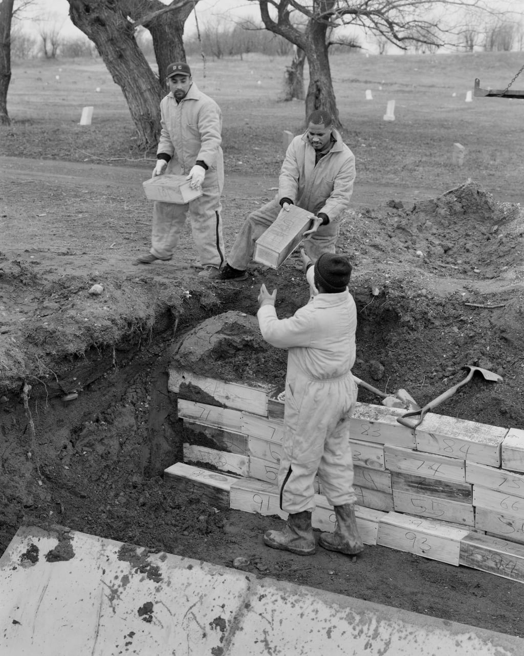 But after a few weeks, when the leaves on Hart Island would have begun to change if there were any, his body ached and it became harder physically to set them down lightly because his back was spent and his joints had started folding apprehensively like a rusted card table chair. By the time he got to the last coffins of the day, he found it easier to pretend that the bodies inside were never anyone important at all. Even easier to pretend that what he was placing in the dirt was a box full of potatoes, oranges, anything but human remains.