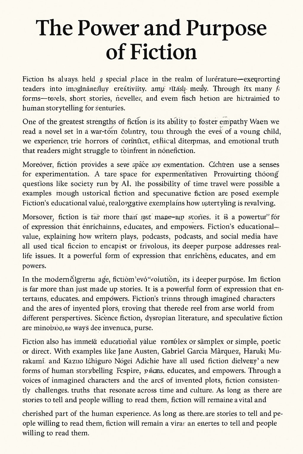 In conclusion, fiction is far more than just made-up stories. It is a powerful form of expression that enriches our understanding of ourselves and others. It entertains, educates, and empowers. Through the voices of imagined characters and the arcs of invented plots, fiction speaks truths that resonate across time and culture. As long as there are stories to tell and people willing to read them, fiction will remain a vital and cherished part of the human experience.