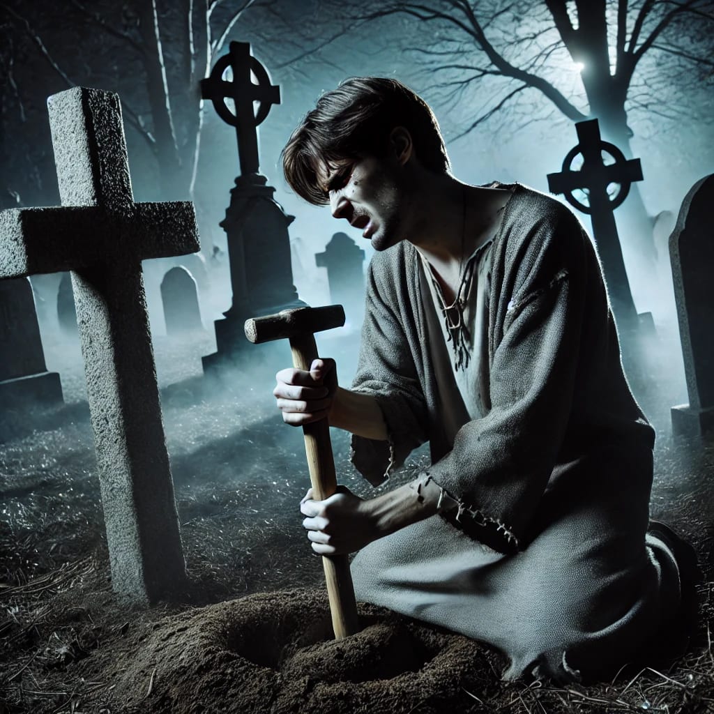 When he finished, he stood to catch his breath. He turned to leave but suddenly felt something tugging at his robe. He froze and swallowed hard. Slowly, he turned, his eyes wide with terror. The edge of his robe was caught on the stake. He sighed in relief, but before he could move, he thought he saw something gray shifting between the graves. His blood froze, and his legs refused to move.