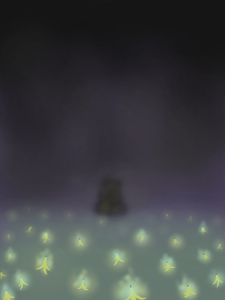 Before me was a weird foggy, desert plane with banana peels all around...? The sky was so dark, but the ground was lit by the peels. There was something off in the distance, but I couldn’t see it well. I tried to take a step forward… but I couldn’t move?