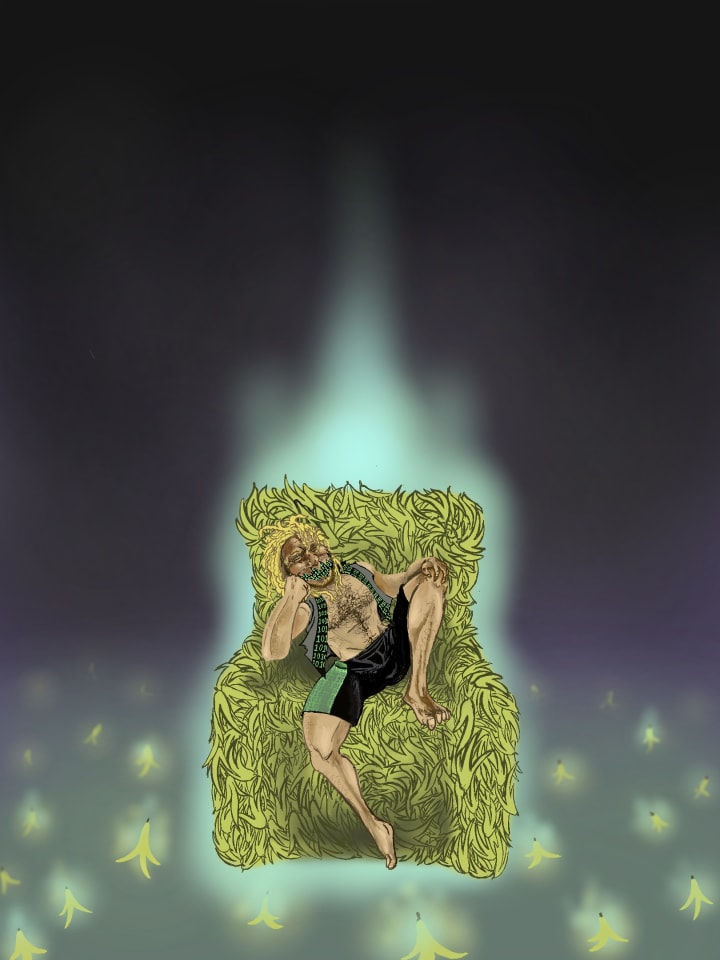In front of my eyes was a throne made of banana’s and I saw myself sitting on it? Except this version of myself had a mouth like 3.14’s and instead of the 0’s being before the 1’s it was the opposite? The 1’s were before the 0’s. He or the other me was barely clothed and sat in his throne in a very lax, nonchalant manner.