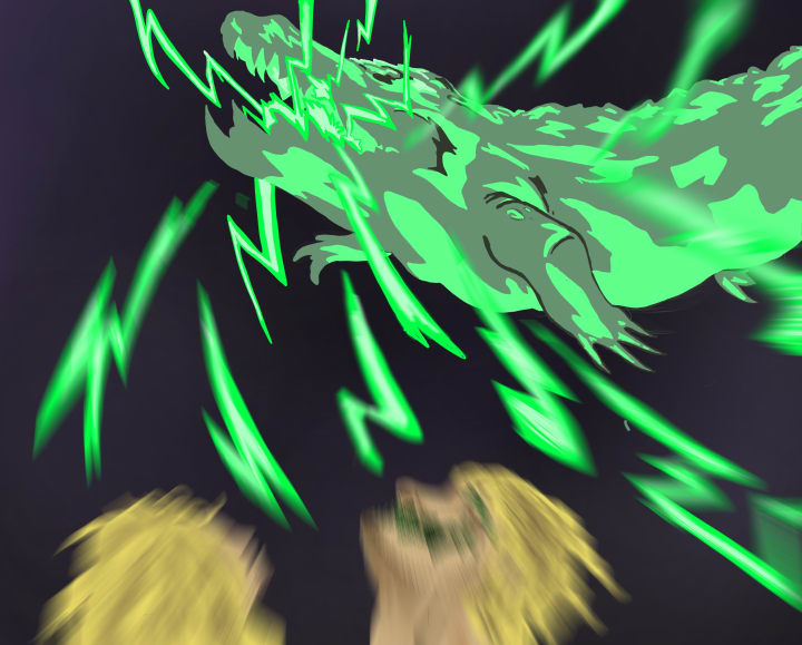 Green light beamed out of the crocodile’s mouth and the tyrant was struck by god-like lightning.