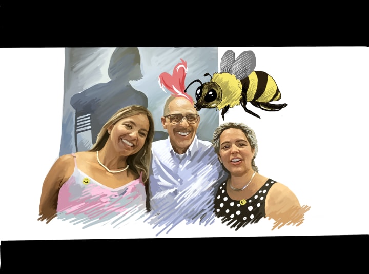 As one part of her started working on my brooms, she turned to me and showed me a photo of her family. She said enthusiastically, "Look boy, this is my family; they took this photo for a family reunion but both my son and I missed our flights, so we couldn't make it. I used to be an artist, so I drew myself as a bee in the photograph. After all, I was always the Queen Bee even before the spell changed the world. Organizing is my specialty and tool-making is my hobby/ superpower."
