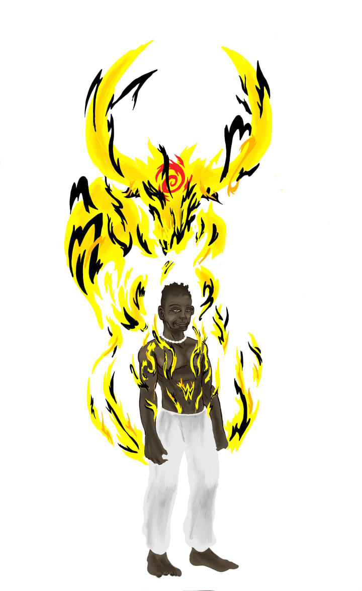 Ako picked up two claws of Charlie's and surges of energy emanated from his body like yellow/black tattoos. A raging bull with massive horns formed from the energy and horn-like dual blade daggers extended from his hands.
