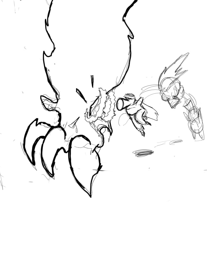 Augusto hopped on two Buttons and flew off to the right side. 3.14 followed suit, the planted half of CJ stayed put and fired Okuutuu Imola charged cannons away with light imbued coconuts. I made a long mark from a wide slash. The mark felt my intentions and moved like a slithering snake when I hopped onto it. The mobile half of CJ hopped onto my mark and joined in on my ride. Maxx ran straight ahead to the enemy’s feet and started shooting some sound blasts at their feet. Italia started fighting off the beast’s tentacles with her own. Jo ran to the outskirts within a flash and cheered us on from the sidelines.