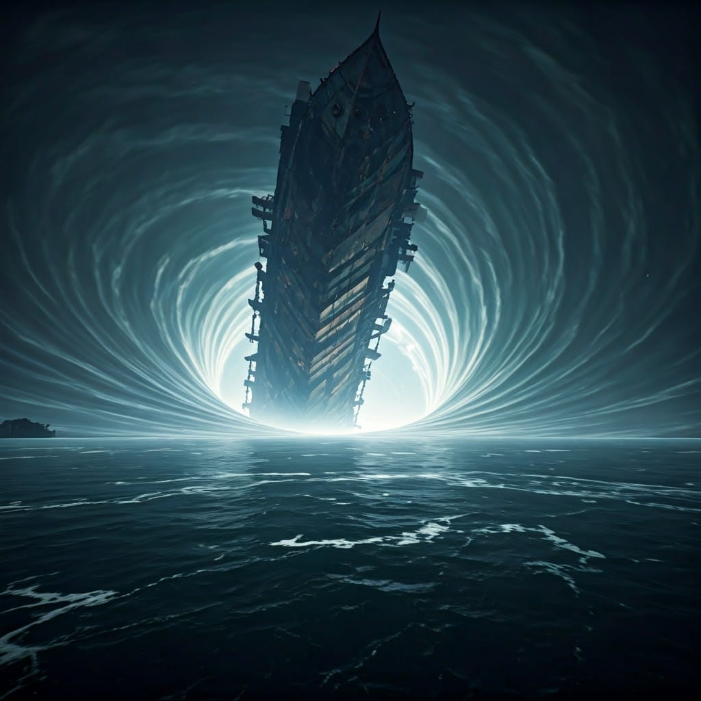 The water swirled and pushed back up the river and the ship was being sucked down into the depths. The bay was not very deep but the ship was going down well into the bottom of the bay.