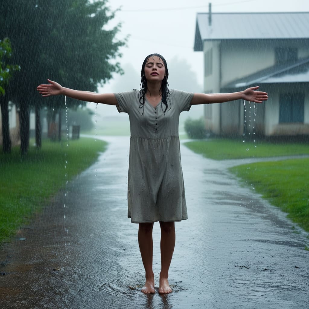 But Mira didn’t hide like she used to. She stood in the rain, face lifted toward the sky, arms open wide. She let the storm touch her — not to hurt, but to cleanse. The rain washed over her like a baptism, cleansing years of silence and fear.