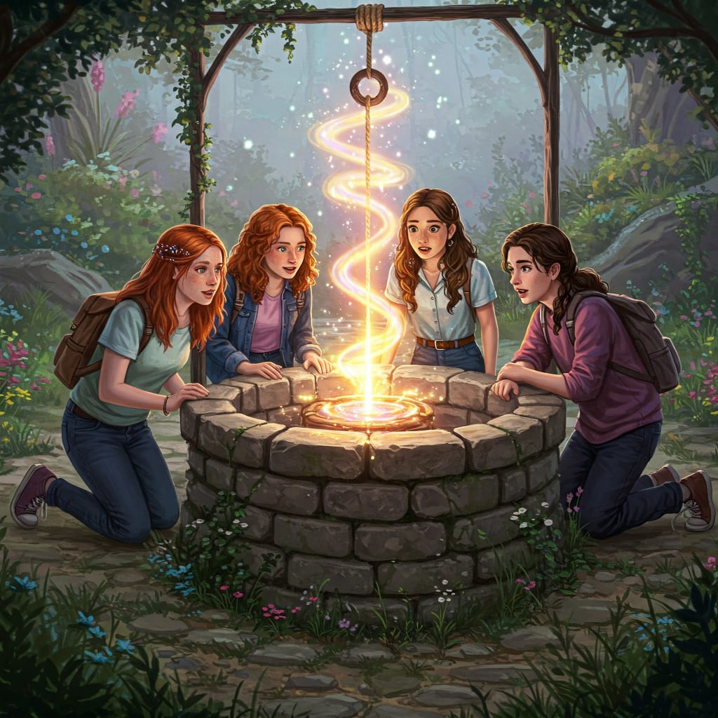 From that day on, the four friends had a secret. They knew that behind the old, sad house, hidden in an ordinary well, was a door to a world of purple skies, silver trees, and friendly, hopping creatures. They often went back to the well, hoping to see the colorful glow again, ready for their next amazing adventure. And sometimes, just sometimes, they would see a faint shimmer in the air, a promise of the magic waiting just beyond.