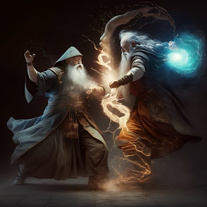The two wizards faced off in an epic battle, using their powers to their fullest extent. The people watched in awe as the two sorcerers clashed, each determined to come out on top.