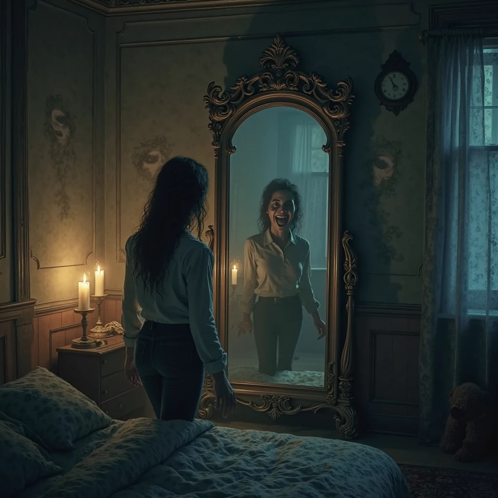 Over the next week, strange things kept happening. Sometimes, when I passed by the mirror during the day, I wouldn’t see anything at all—no reflection. Just the room behind me, empty. Other times, I saw my reflection... but it was wrong. Wearing clothes I didn’t own. Bruised where I was not.
