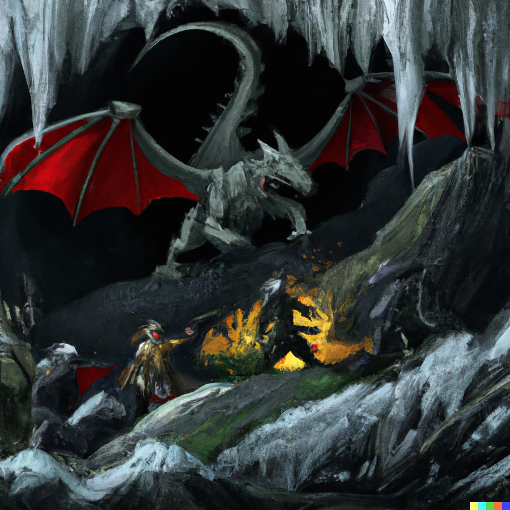 "I climbed up to the tall outcropping, the wall was slick and puddles covered the overhang. I went to knock an arrow, my bloody foot slipped in the wet and I released the bolt early, the shaft struck the ceiling of the cave. It must’ve hit one of those roof cracks just right because it loosened a huge ass stalactite that fell on the bloody wyvern’s head. Crushed it with a big ole splat on the ground.” Sir Nicholas leaned back and twirled at his mustaches.
