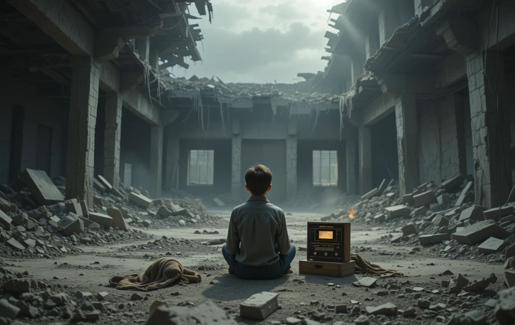 He crouched beneath the skeleton of what used to be a bookshop, knees pressed to cracked tile, hands around a tin of beans his neighbor had traded for half a pack of cigarettes. Around him, broken pages fluttered like injured birds.