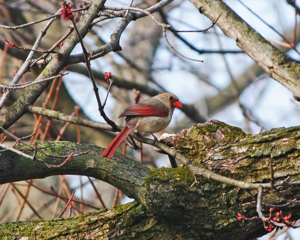 As she walked, deeply lost in her thoughts, a tiny glimmer caught her eye. She followed the sparkle until she reached a small clearing. There, nestled among the messy branches of a pine tree, was a small red cardinal. Its vibrant plumage stood out against the monochromatic landscape, like a burst of color. The bird chirped, its song breaking the silence, and she felt a surge of joy. It was as if the cardinal appeared to remind her that even in the midst of desolation, there is beauty and hope.