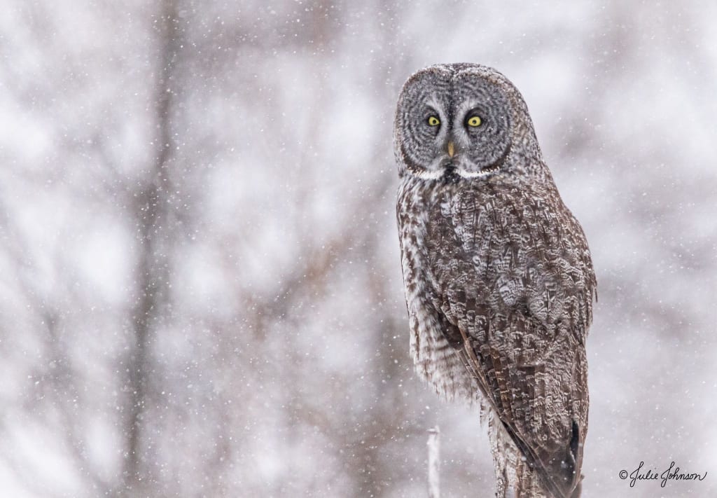 The brown bars in its plumage blend perfectly with the winter bark, and the softly falling snow perfectly matches its white speckles. Even as close as he is, if he blinks or turns away he will have trouble seeing it again.