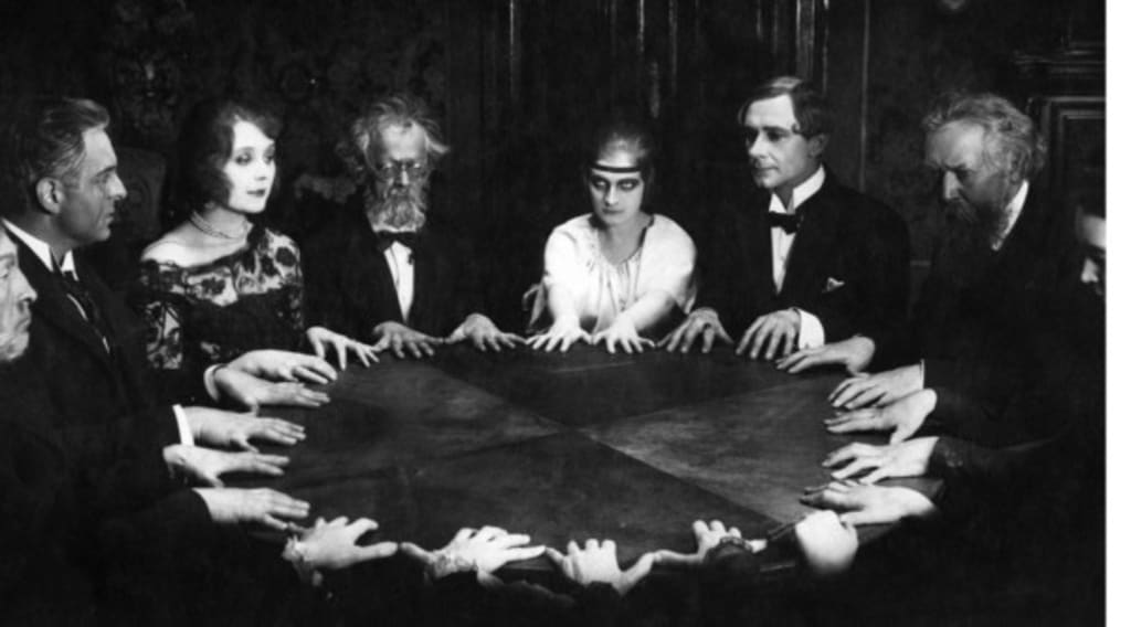 The audience looked on expectantly as the Spiritualist placed her hands flat on the table. Those seated around the table quickly followed her lead; their splayed fingers connected to form a jagged circle. The Spiritualist closed her eyes, altering the rhythm of her breathing. For a few moments, her lips moved in silent conversation.