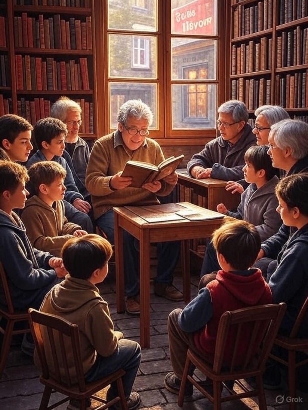 Each dawn, he carried his passion to the town square, where he’d sit beneath an ancient elm, reading aloud. His voice, weathered yet rich, danced through the air. Children giggled at Roald Dahl’s whimsy; workers, pausing mid-stride, lingered for Orwell’s truths; elders smiled at Brontë’s passion. “Stories belong to everyone,” he’d say, his words a soft rebellion against a world that priced knowledge.