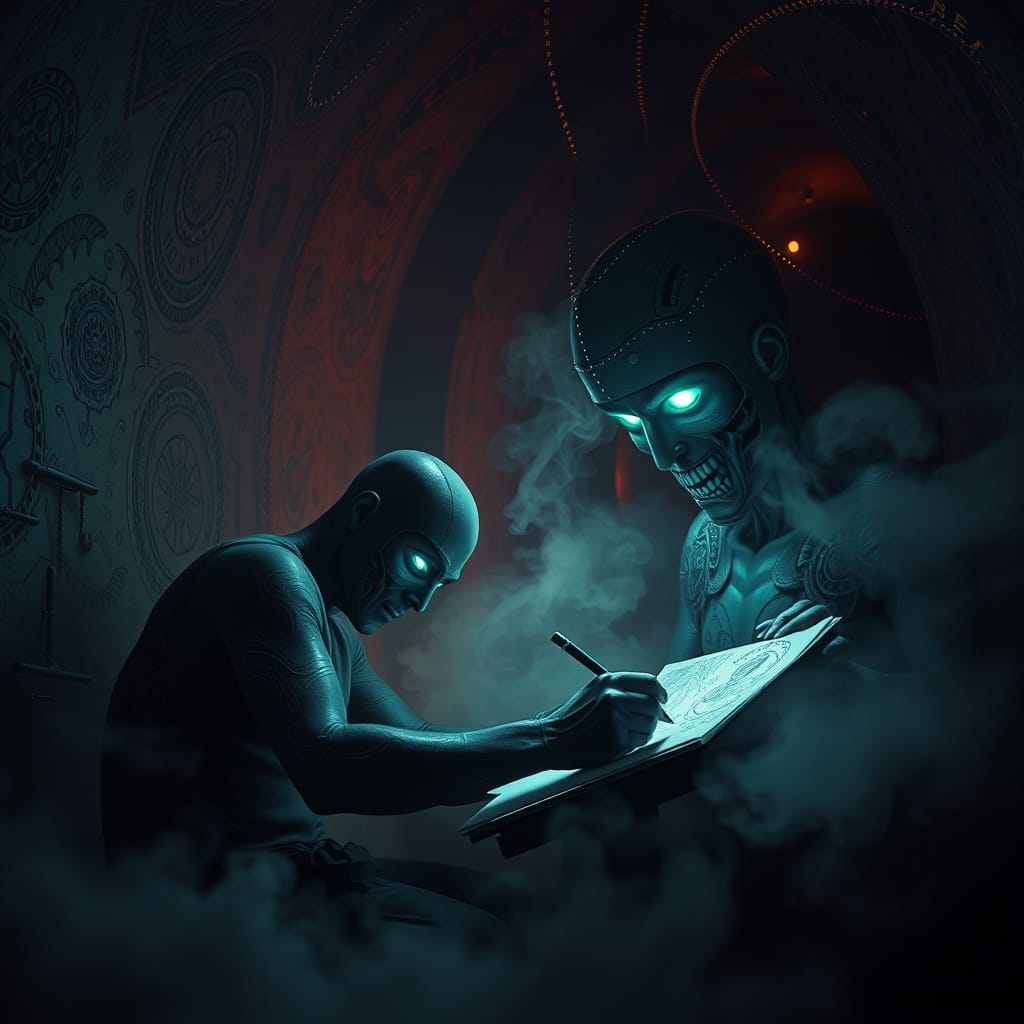 The walls are lined with glyphs and intricate arcane symbols. The air is thick with a strange, oily mist, and the artist's eyes glow with an unsettling, neon-green light.