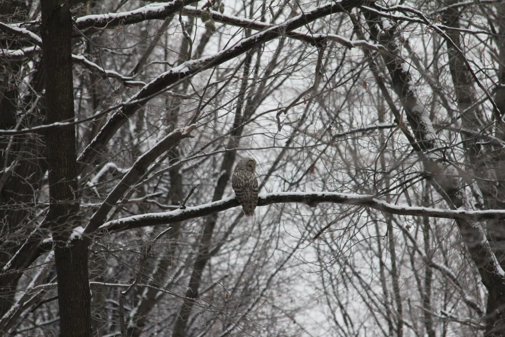 Amongst the sea of white snow, the blackened dead trees, and the pale grey sky above, a small tawny owlet awakes in her nest. With her ruffled brown feathers and rounded face, she shook off the light snow from the night. As the sun glistens through the lifeless branches, she gets out to stretch her wings.