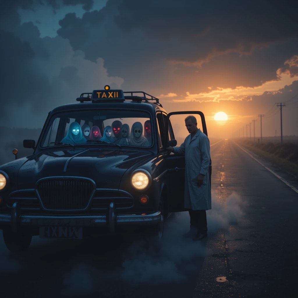 The driver, a lean figure in a dark cap and heavy coat, said nothing. His face was obscured by shadows, and the only light came from the dull glow of a flickering ceiling bulb. The dashboard didn’t show a speedometer, just a softly pulsing meter that read: “Passengers: 1.”