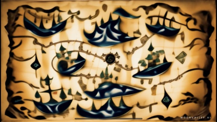 On one fateful day, as she scoured a rocky river bank, Sandy spotted an ancient bottle half-buried in sand. Intregued by this interesting find, she cautiously dug it out, her heart pounding at the thought of what might lie within. On inspection, she found a roll of weathered parchment inside the old glass container. Unraveling it revealed a treasure map loaded with mysterious symbols and paths leading to an undetermined place.