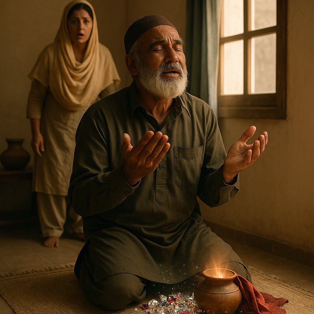 In a burst of rage, he threw the pot through Ubaid’s window. The pot crashed inside the room and shattered loudly. Startled, Ubaid and his wife rushed in. To their amazement, the broken pieces of the pot lay scattered on the floor, and among them were sparkling diamonds and precious stones just as Ubaid had seen earlier.