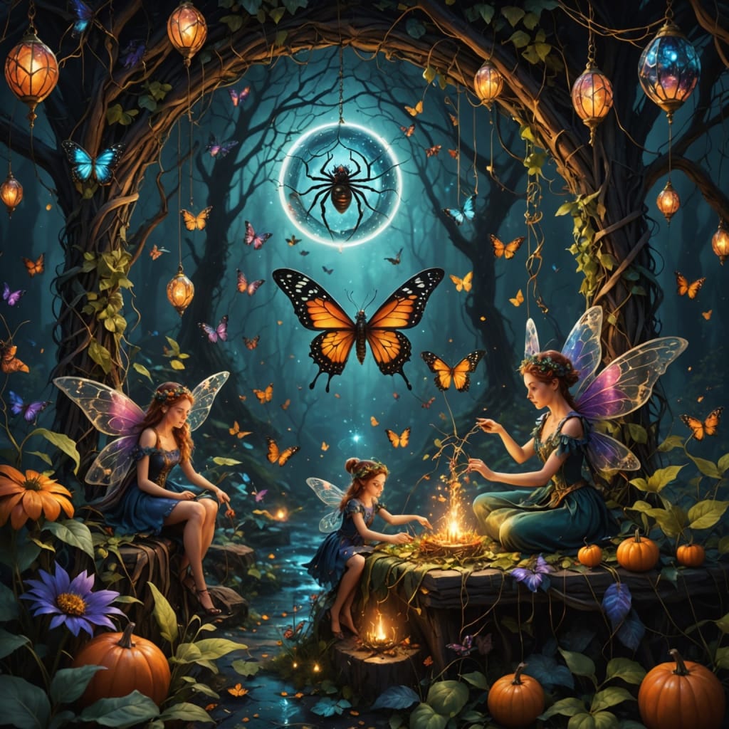 The fairies and their insect aids, butterflies and spiders, take the treads from the old year's tapestry and weave a new one for the coming year.